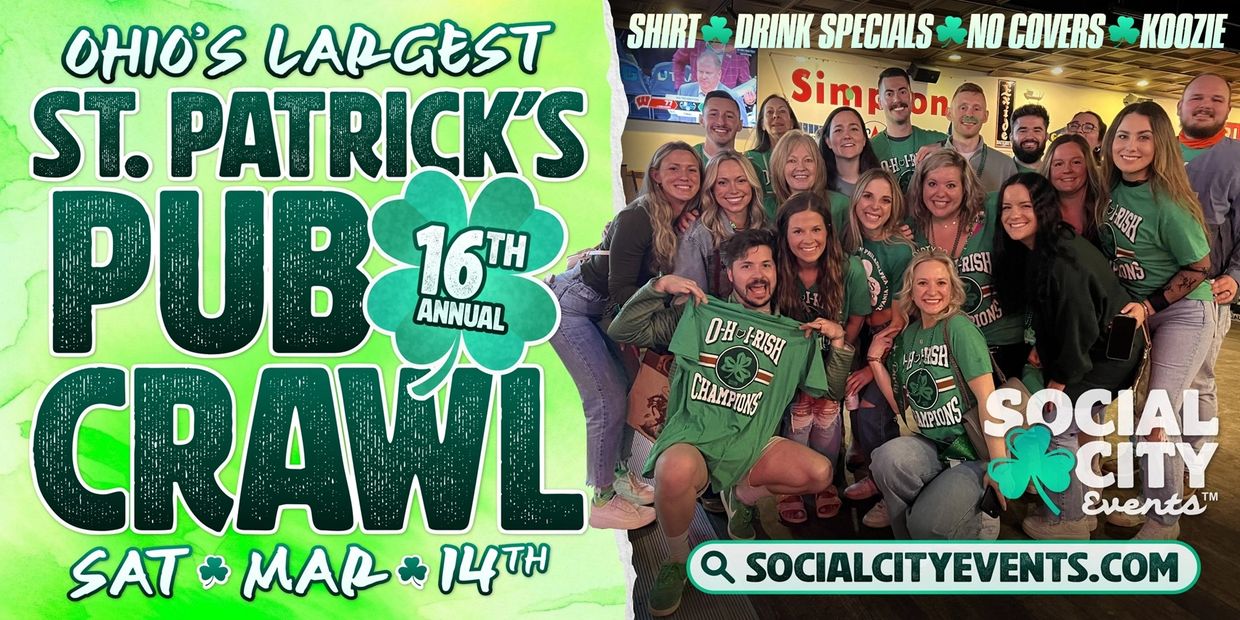 Ohio's Largest St. Patrick's Pub Crawl is this Saturday, March 14th from 12pm-8pm in Columbus! Attendees receive an awesome t-shirt, drink specials, koozie, free cover charges, and more! (Attendees must be 21+ years old.) Get tickets online for $26 + fees. At the door price is $35 (If not sold out).